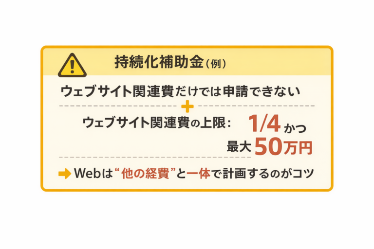 - 対象経費:販路開拓等を目的とするHP制作委託費(年度内支払い完了、スマホ対応など条件あり)